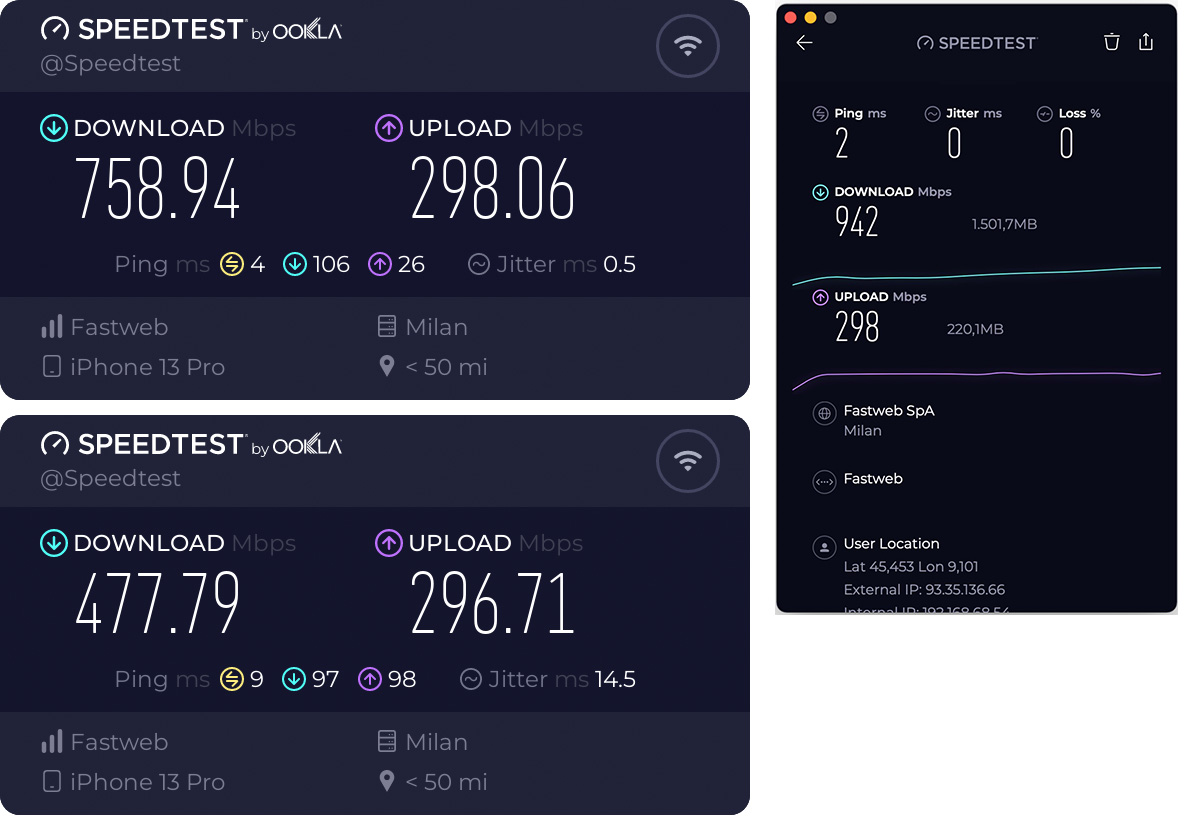Eccellente è anche la performance del backhaul basato su Wi-Fi 6E, che permette a un Mac non recentissimo posizionato in prossimità di un’unità remota di raggiungere i 942 Mbps (sia in Wi-Fi sia via Ethernet), al limite della velocità teorica (1 Gbps) a valle.