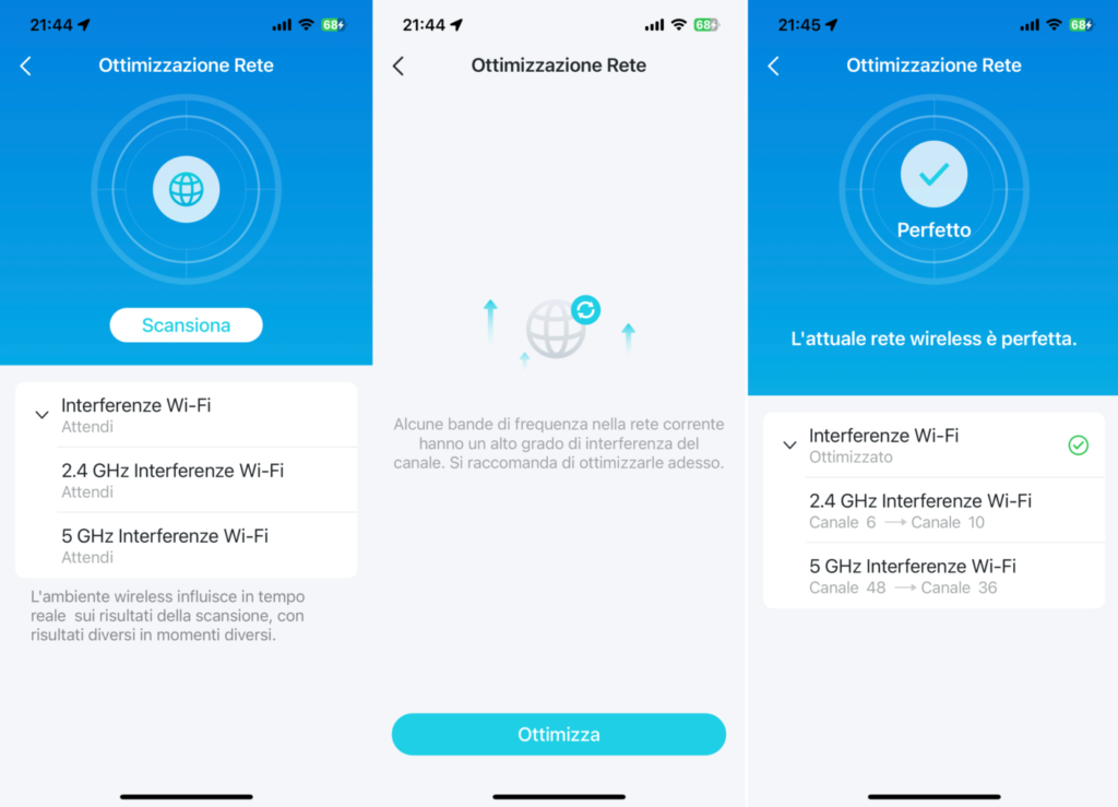 Il tuo chilometraggio potrebbe variare, dicevano per tutelarsi da possibili contestazioni i produttori di auto che magnificavano i bassi consumi dei loro nuovi veicoli. Questo avvertimento vale anche riferendosi alle prestazioni di un sistema Wi-Fi, che – specialmente in ambienti eterogenei come le abitazioni – sono influenzate da un gran numero di fattori, fisici e ambientali. Muri, porte, mobili, ostacoli riducono l’ampiezza dell’area in cui il segnale Wi-Fi ha potenza sufficiente e quindi la velocità massima raggiungibile. Interferenze di altre reti Wi-Fi o di apparati elettrici possono ridurre in modo importante le prestazioni. Posizionare, per quanto possibile, gli access point riducendo al minimo gli ostacoli fisici fra loro aumenterà sicuramente le prestazioni. Per il secondo tipo di ostacoli entra in aiuto la funzionalità di Ottimizzazione Rete offerta dall’app deco, che identifica automaticamente eventuali interferenze riassegnando i canali utilizzati.