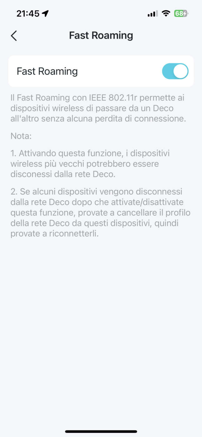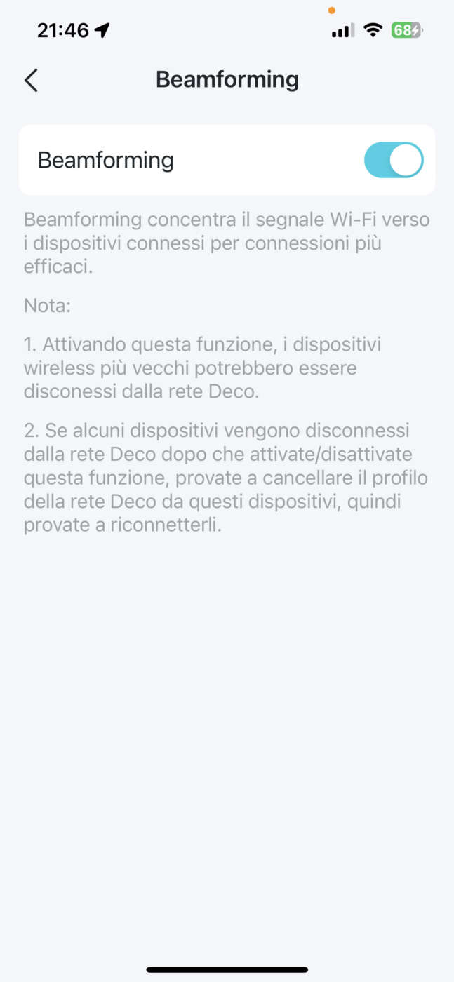 Un’ulteriore tecnica di ottimizzazione del segnale è il Beamforming, che concentra il segnale Wi-Fi verso i dispositivi connessi, invece di distribuirlo uniformemente. Questa funzionalità è disabilitabile, sempre dall’app Deco, in caso di utilizzo di dispositivi più vecchi, per i quali comunque è consigliato, in caso di disconnessione, di provare a cancellare il profilo dalla rete Deco e provare a riconnetterli. È apprezzabile l’attenzione a indicare possibili soluzioni ai problemi che si possono verificare, direttamente nell’app, senza dover esplorare raccolte di knowledge base online.