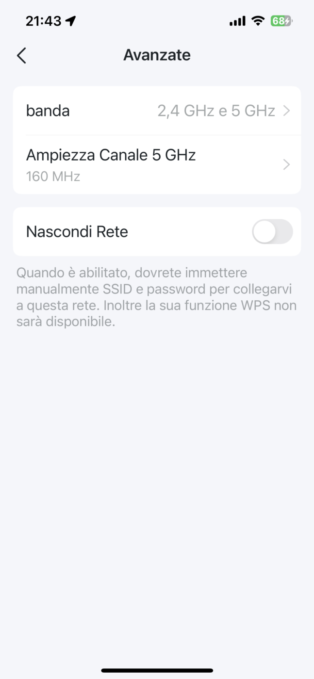Trattandosi di un dispositivo tri-banda – 2.4 GHz, 5 GHz, 6 GHz – occorre sottolineare che non è possibile creare reti separate per le bande 2,4 e 5 GHz, ma soltanto abilitare una, l’altra o entrambe le bande. La limitazione non crea generalmente problemi, salvo nel caso sia necessario collegare dispositivi IOT in grado di utilizzare soltanto reti a 2,4 GHz. In questo caso abbiamo risolto facilmente il problema disattivando momentaneamente il 5 GHz, operazione che non richiede alcun riavvio delle unità, configurando il dispositivo IOT sulla banda 2,4 GHz e riattivando, subito dopo, entrambe le bande.