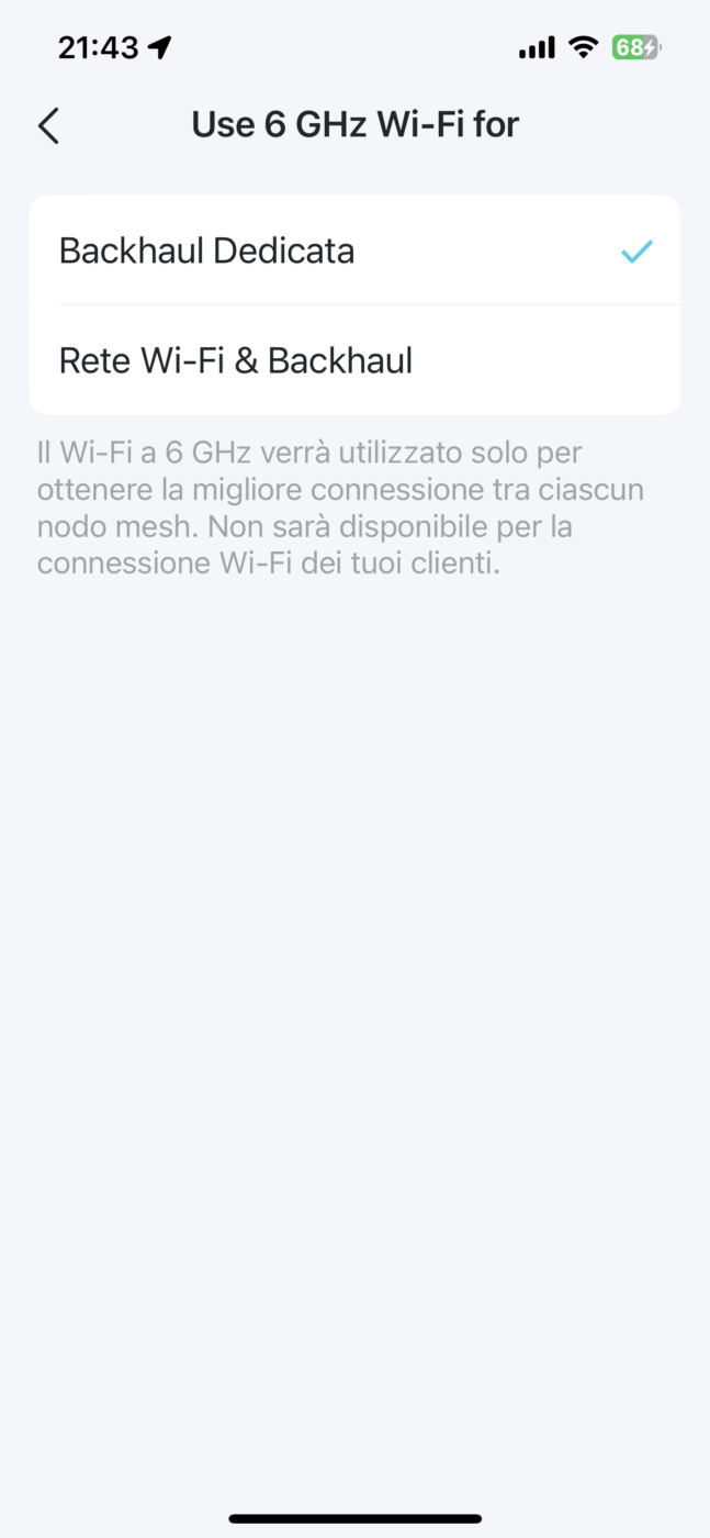 La banda 6 GHz, specifica del Wi-Fi 6E, è gestita separatamente sui TP-Link XE75. È possibile dedicarla soltanto al backhaul tra le unità o condividere questa banda con la rete Wi-Fi per la connessione dei dispositivi. Nel primo caso si massimizza ovviamente la velocità complessiva. Non sono ancora molti i device Wi-Fi 6E, soprattutto tra i computer desktop e laptop (non implementa 6E, ma soltanto Wi-Fi 6, per esempio, il recentissimo Macbook Air 15”), e quindi si potrebbe pensare che un sistema mesh 6E sia sprecato se non si possiedono device che supportano tale standard. Crediamo sia invece vero il contrario. Proprio la disponibilità di una nuova banda, ancora scarsamente affollata, e con canali ad alta capacità, permette di utilizzarla per collegare tra loro le unità e garantire la massima velocità anche ai device connessi alle unità più distanti da quella collegata alla Rete. Nel nostro test, a valle delle unità remote abbiamo misurato un transfer rate appena sotto quello teorico di 1 Gb/sec, imposto dalla velocità massima delle porte Ethernet con cui la prima unità è collegato al router del provider (Fastweb). Il vantaggio offerto è evidente, a confronto con sistemi Wi-Fi 5 (transfer rate intorno ai 600 Mbps a valle dell’unità remota) o Wi-Fi 6 (poco più di 800 Mbps).