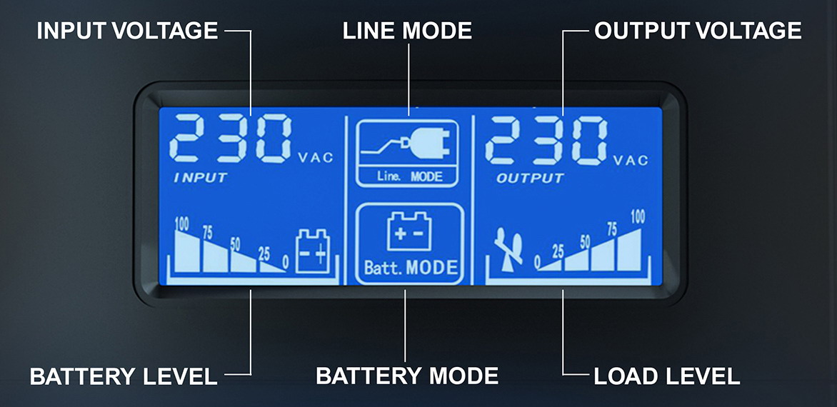 Gli UPS di fascia economica sono dotati di spie led che indicano lo stato operativo (UPS acceso in modalità rete o batteria/backup, batteria in carica/scarica/da sostituire, ecc.) mentre quelli di fascia media e alta hanno un display LCD o led decisamente più prodigo di informazioni (tensione di ingresso/uscita, potenza di carico, livello carica batteria, modalità di funzionamento, ecc.).