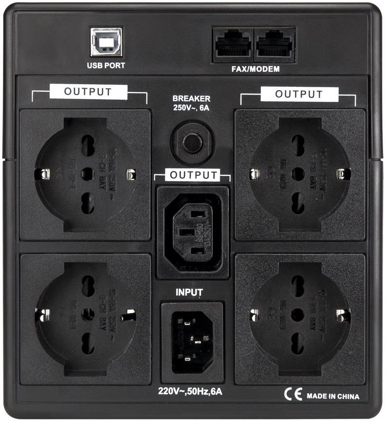 Integra una batteria da 12Vcc da 7Ah a 11Ah a seconda della potenza fornita, due prese Schuko e una porta USB-B (solo modelli 1200VA e 1600VA) per il collegamento al PC, il monitoraggio dei parametri dell’UPS e lo spegnimento/accensione automatici con software TecnoManager (Windows, Mac OS X, Linux, ecc.).