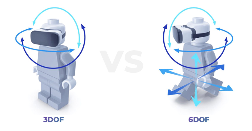 Per caratterizzare le possibilità di movimento che si hanno nelle scene VR si utilizza il parametro DOF (Degrees Of Freedom) che individua il numero di gradi di libertà che l’osservatore ha nei suoi movimenti sulla scena e che possono essere 3 o 6. Il 3DOF è quello tipico dei video 360°, nei quali è possibile solamente assecondare i movimenti della testa e guardarsi intorno nelle tre direzioni. Non si possono fare quindi passi avanti/indietro, non ci si può chinare o avvicinarsi ad un oggetto, tant’è che spesso è consigliata la visualizzazione dei contenuti da seduti. Ciò che vede l’utente è il punto di vista di una telecamera che ha scattato/ripreso da un punto fisso.