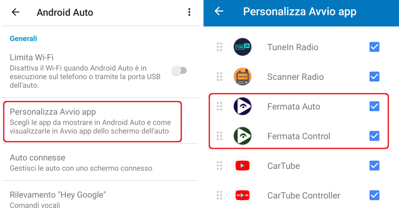 Completata l’installazione andate nelle impostazioni della app Android Auto (sempre sullo smartphone), cliccate su Personalizza Avvio app, controllate se le app Fermata Auto e Fermata Auto Control sono spuntate e trascinatele in alto.