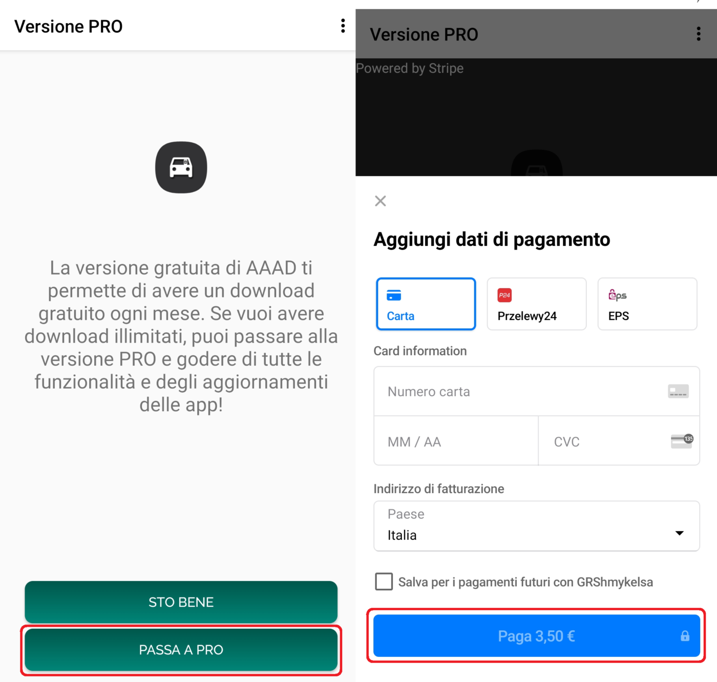 AAAD permette di scaricare gratuitamente una sola applicazione al mese tra quelle in elenco (app multimediali, di mirroring, altre). Per passare al piano PRO con download illimitati e altri benefici basta cliccare in basso su “Hai ancora un download a disposizione” oppure “Non hai più download a disposizione”, poi su Passa a PRO e fare una donazione di 3,50 euro tramite carta di credito.