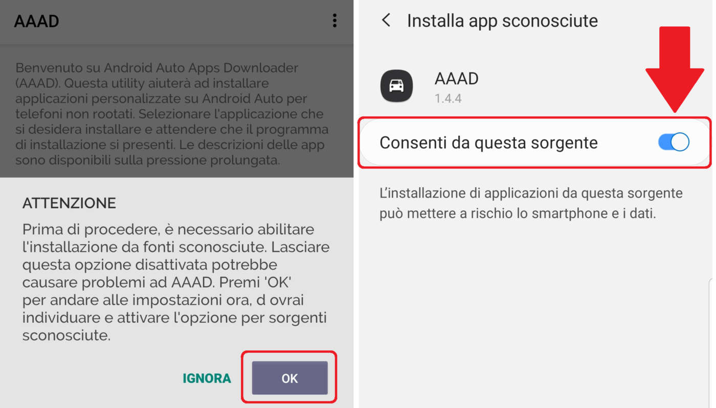 Dopo averlo installato e lanciato cliccate su OK sul messaggio di avviso (Attenzione – abilitare installazione da fonti sconosciute), cliccate su AAAD e attivate l’opzione Consenti da questa sorgente (slider a destra).