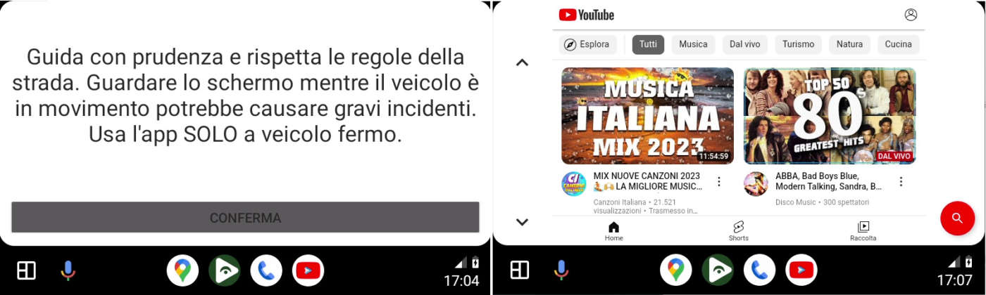 Cliccate su CarTube, leggete le avvertenze di sicurezza, cliccate su CONFERMA e selezionate uno dei tanti contenuti di YouTube (anche tramite il motore di ricerca).