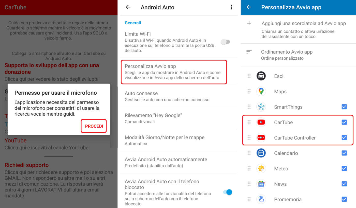 Completata anche questa installazione andate nelle impostazioni della app Android Auto (sempre sullo smartphone), cliccate su Personalizza Avvio app, controllate se le app CarTube e CarTube Controller sono spuntate e trascinatele in alto.