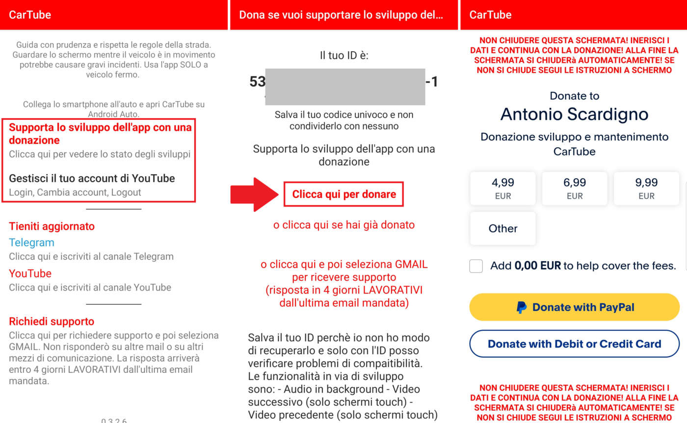 La versione gratuita di CarTube è limitata e consente di accedere ai contenuti solamente a vettura ferma. Per sbloccare tutte le funzionalità (visione in movimento, preferiti, login con account personale, ecc.) dovete cliccare su Supporta lo sviluppo dell’app con una donazione, cliccare su Clicca qui per donare, selezionare l’importo (minimo 4,99 euro) e procedere con il pagamento (PayPal, carta di credito, ecc.).